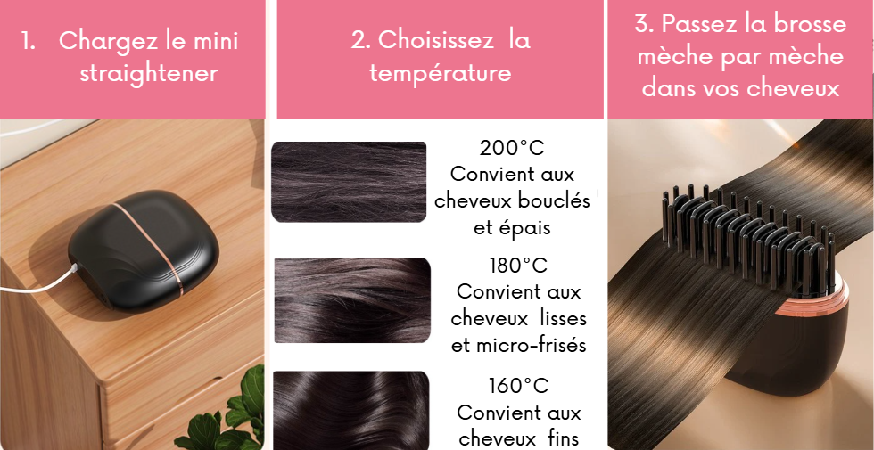 La mini brosse lissante est entièrement sans fil et offre jusqu'à 45 minutes d'utilisation selon la chaleur choisie. Elle se recharge facilement cia USB